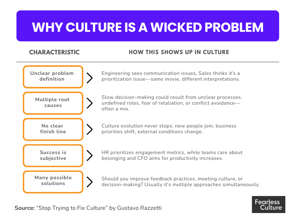 Culture is a wicked problem: It's complex, unclear, has multiple root causes, and many possible solutions. All characteristics of wicked, not tame problems.