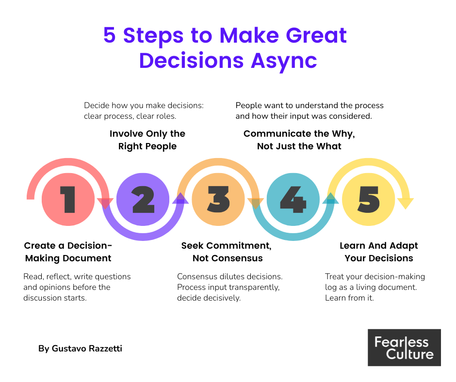 Here are five actionable steps to help you get started. Adapt them to your specific needs. The goal is to have an async-first decision-making approach, not to eliminate all meetings. Use meetings as a last resort – not the central tool – of your decision-making process.