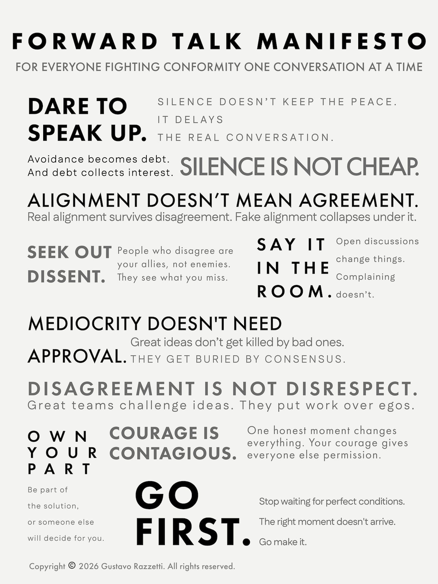 Every movement starts with a declaration. I wrote the Forward Talk Manifesto as mine. Download your copy and discuss it with your team.
