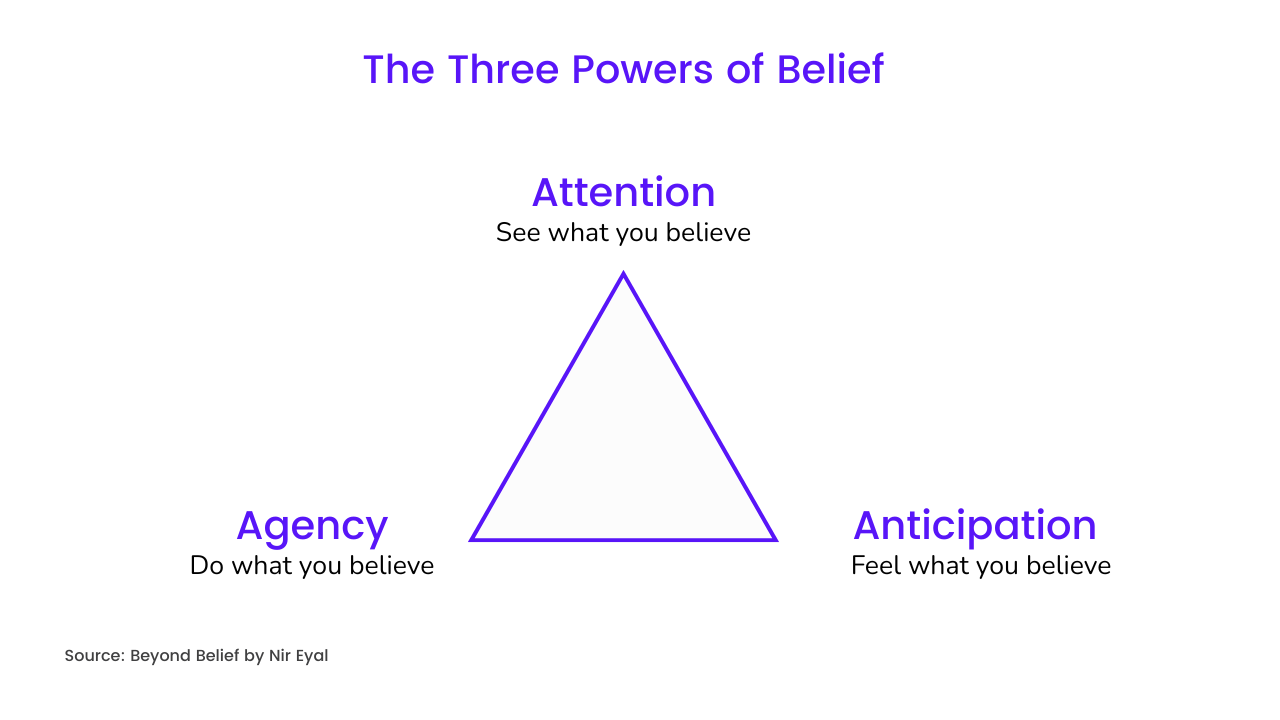 Eyal peels back the science and practice of beliefs, layer by layer. The author uncovered three common patterns —the “Three Powers of Belief”: attention, anticipation, and agency.