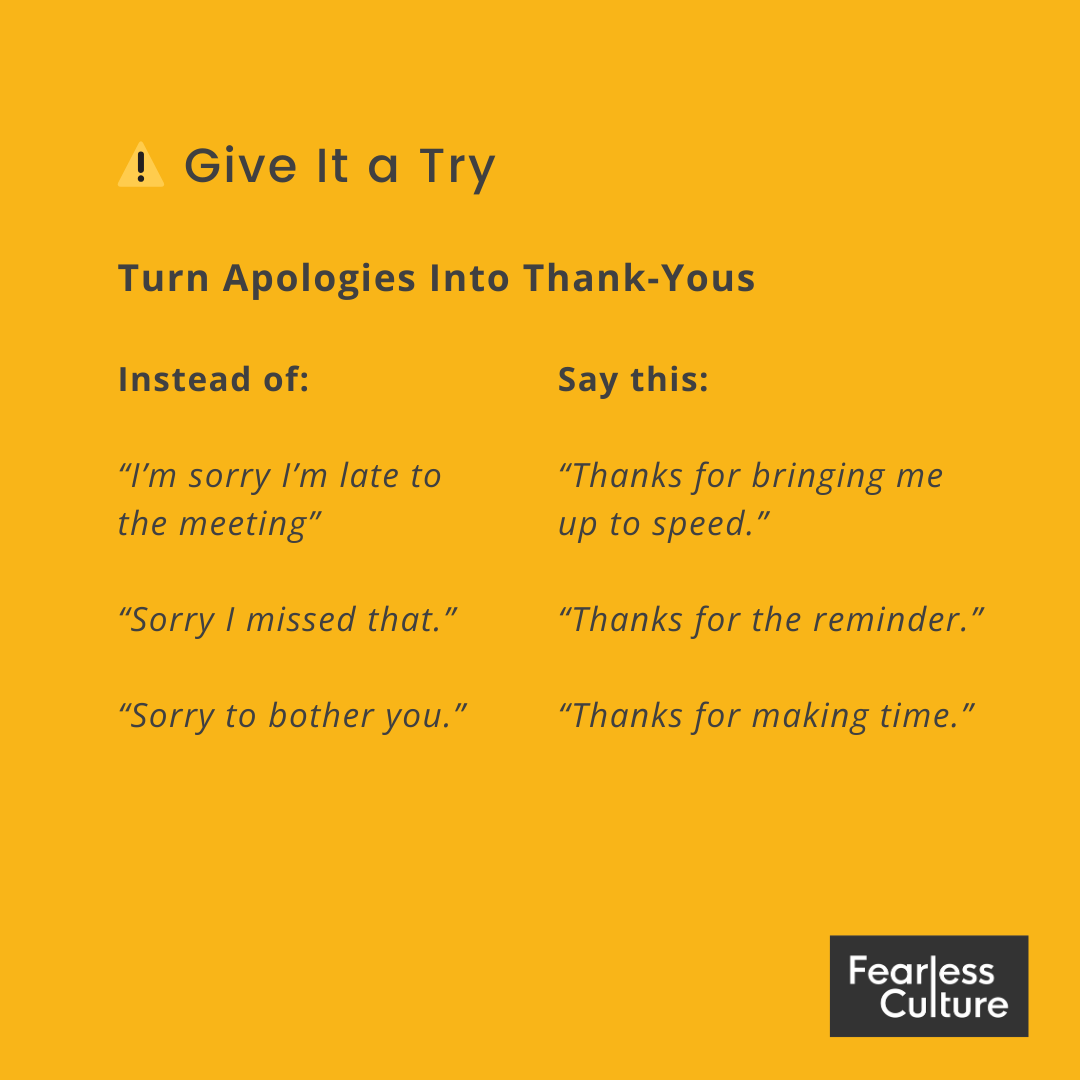Instead of “I’m sorry I’m late to the meeting,” say: “Thanks for bringing me up to speed.”