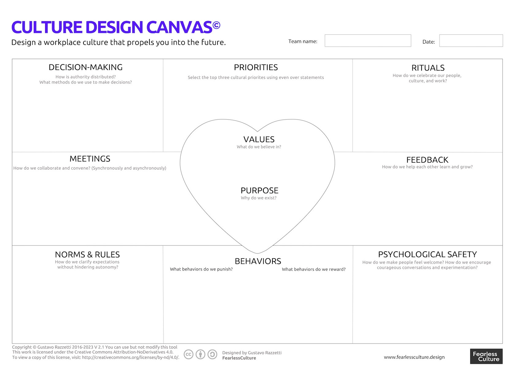 The Culture Design Canvas helps organizations map their culture to both provide clarity and understand the gaps between current and future states. It’s the foundation of most of the work we do at Fearless Culture.